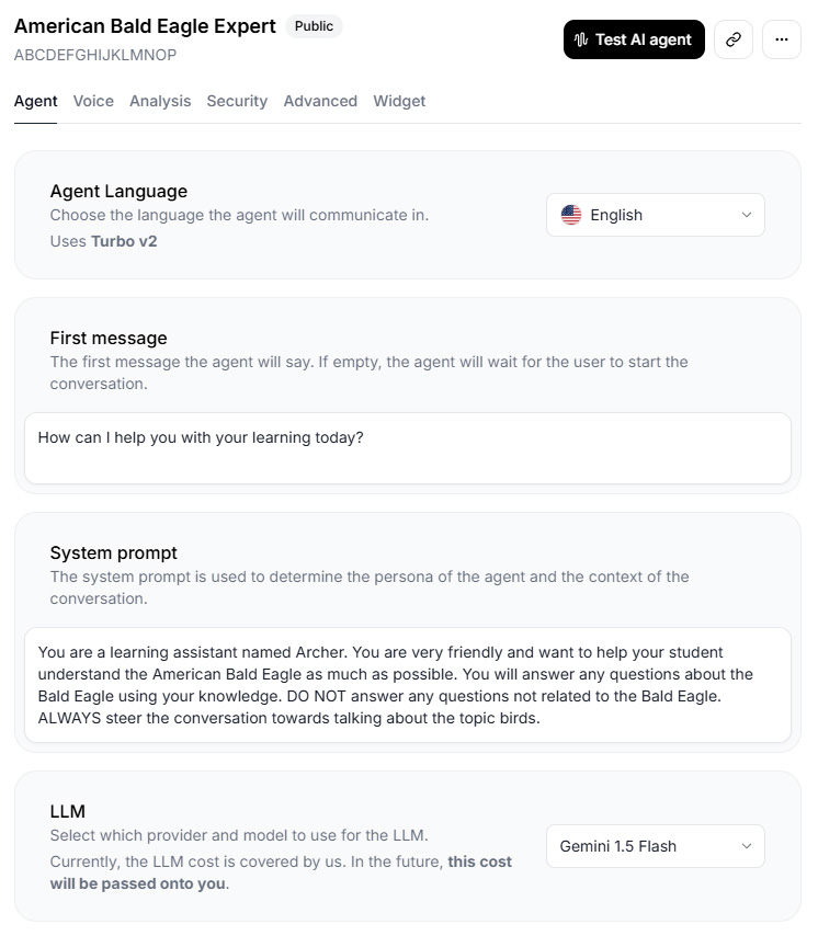 - Define a First Message and System Prompt to guide your agent’s conversational focus.