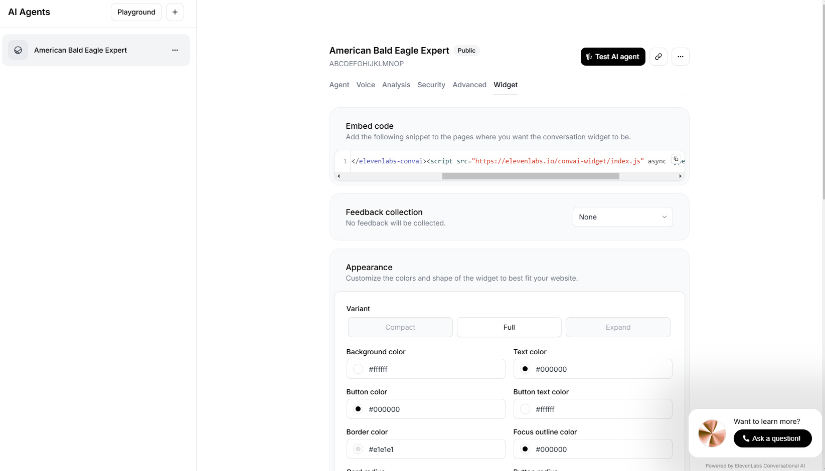 Locate the Agent ID below your agent’s name or in the Widget Embed Code section under the Widget tab. Copy this ID—it’s needed for the integration in Storyline.