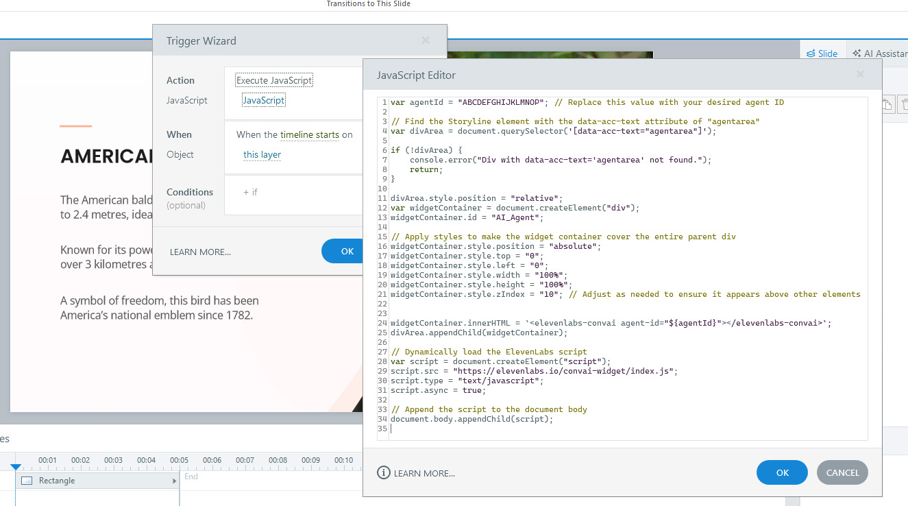 This tutorial will guide you through the process of integrating ElevenLabs’ Conversational AI into your Storyline 360 projects.