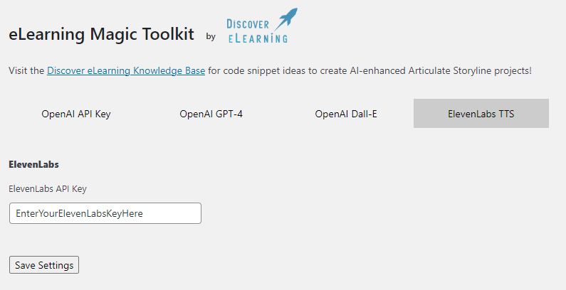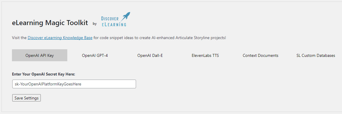 The configuration setting for the OpenAI integration features included in the eLearning Magic Toolkit plugin can be found in your WP-Admin Settings>eLM Toolkit screen, as soon as the plugin has been activated and licence key registered.