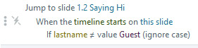 In this trigger example we are sending the user straight onto the slide which welcomes them to the course if the lastname variable value IS NOT ‘Guest’. This signifies that the Storyline project has captured the learner’s name to variables and therefore we do not need for them to type their name manually.