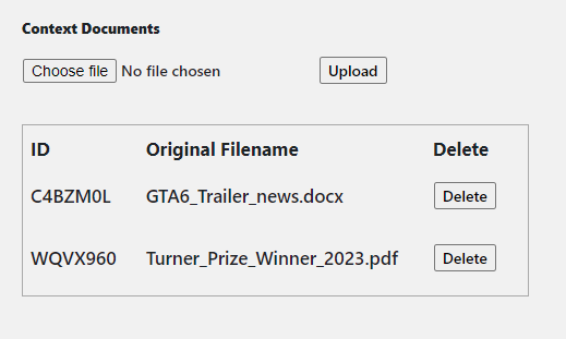 When the file has been uploaded you will see this displayed in the table, along with the ID code which has been dynamically generated to identify the document within the system: