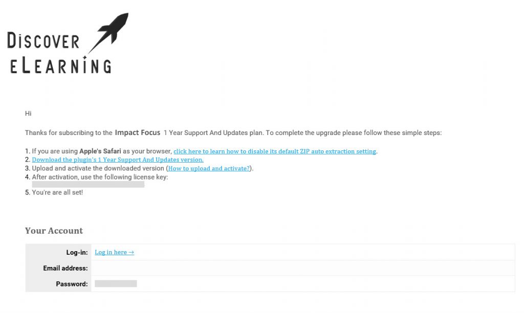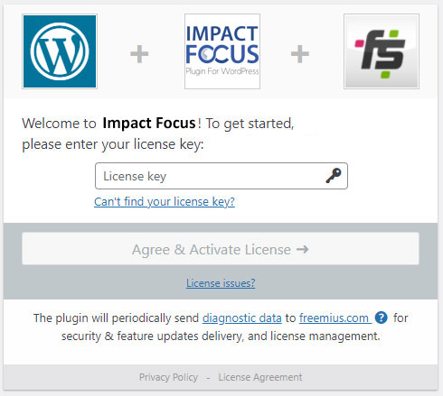 When you purchase Impact Focus, you’ll receive an email from our trusted plugin reseller Freemius. The email contains everything you need in order to download the plugin ZIP file, as well as your licence key information to activate our plugin.