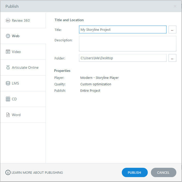 When you publish your project in Storyline, make sure you choose to publish for ‘Web’. Publishing for ‘LMS’ will also work, but the additional files that the LMS publish option produces aren’t necessary in this case.
