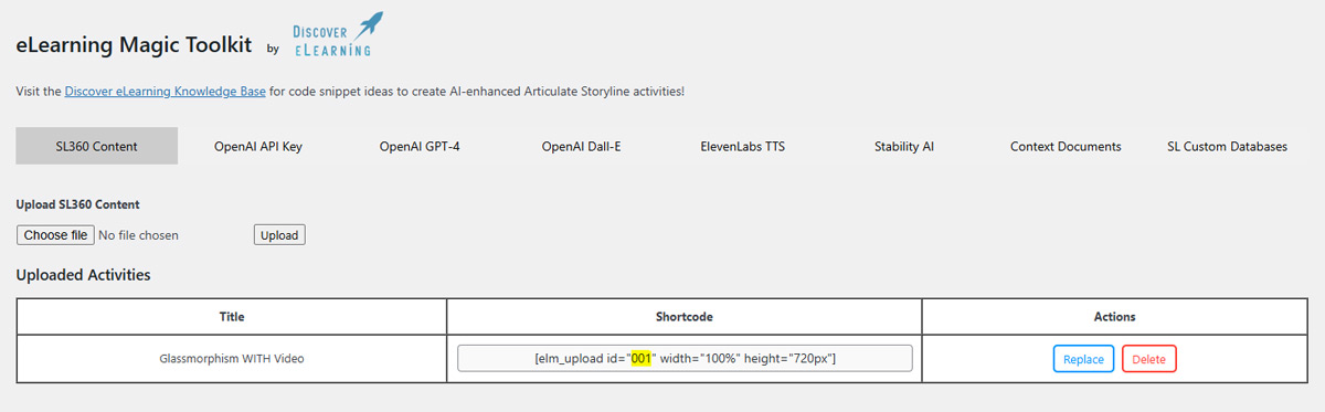 (Replace the parts in all caps in the address above. Your ELM_UPLOAD_ID number is found by looking at the provided shortcode for your activity on the SL360 Content settings tab. For example, the project Glassmorphism WITH Video below has the ID value of 001).