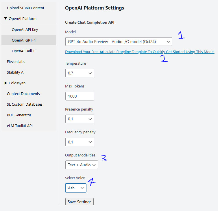 Once this model has been selected, two new options will appear to choose in the settings beneath (3 and 4). This includes whether you wish to have either text, or text AND audio be returned by the AI system, as well as your choice of voice style from those provided by OpenAI.